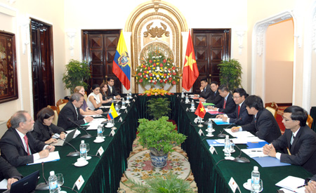 Este lunes, en el encuentro con su par, Pham Binh Minh en el marco de una visita de trabajo a Vietnam del 21 al 25 de junio, el ministro de Relaciones Exteriores y Movilidad Humana de Ecuador afirmó que su país facilitará las inversiones de empresarios vietnamitas, especialmente en los sectores de petróleo y telecomunicaciones. A su vez, el canciller Pham Binh Minh aseguró que Vietnam concede importancia al desarrollo de las relaciones de amistad y cooperación multifacético con Ecuador y con los países de América Latina en general. Ambos titulares intercambiaron sus valoracines sobre la situación en las dos regiones y en el mundo en los temas de interés mutuo, y acordaron intensificar la coordinación y el apoyo mutuo en los foros multilaterales y las organizaciones internacionales como las Naciones Unidas, el Movimiento de los Países No Alineados y el Foro de Cooperación Latinoamérica- Asia del Este. Tras las conversaciones, los dos ministros firmaron el Memorando de entendimiento entre ambos organismos sobre un mecanismo de cooperación económica en en marco de la cuenca del Pacífico.