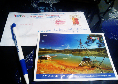 El oyente mexicano, Jese David Gutiérrez Cuevas manda foto de la tarjeta QSL y el bolígrafo de la Voz de Vietnam que le llegaron