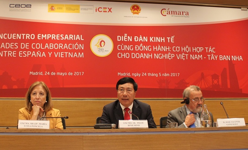 El viceprimer ministro y canciller de Vietnam, Pham Binh Minh (m) en el Encuentro Empresarial-Oportunidades de Colaboración Empresarial entre España y Vietnam, celebrado el pasado 24 de mayo en Madrid |