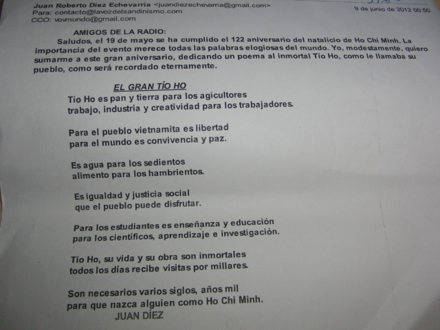 Esta semana, seguimos recibiendo cartas e informes de recepción de Francisco Vázquez Añon, de A Coruña y Salvador Lavín Carral, de Orejo, Cantabria, España; José Moacir Portera de Melo, desde Pontes e Lacerda- MT, Brasil, Yasmany Machado y Alberto Campos Velasco, de La Habana, Cuba; Gerardo Groh, provincia Santiago del Estero, Argentina; y Francisco Llerena Vega, Camana- Arequipa, Perú. El oyentes español Francisco Vázquez Añon, pese a las escasas condiciones de escucha, nos sintonizó en diferentes ocasiones en el mes de mayo y nos aportó 3 reportes. “Siento especialmente no poder entender bien los comentarios sobre Vietnam y más, si se trata de Ho Chi Minh”, expresó Francisco. Por su parte, desde Brasil, nos escribió José Moacir Portera de Melo en su carta fechada el primero de mayo: “Escuché su emisión de las 3 de la madrugada hora UTC, aprovechando que era feriado y pude dormir más tarde. Me gustó mucho el programa, con comentarios de la victoria del pueblo vietnamita sobre los norteamericanos y sus lacayos en 1975. Espero seguir escuchando su emisora, y que en el futuro sea posible escucharles también durante el día.” La verdad que antes teníamos una emisión a las 11 horas UTC y este horario parecía más favorables para los oyentes en Argentina, Brasil y Uruguay, entre otros países sudamericanos. Nos conmueve mucho su interés en escucharnos aunque debe madrugar por ello. Estudiaremos su propuesta para un ajuste adecuado en lo adelante. Mientras tanto, no deje de acompañarnos en el éter.