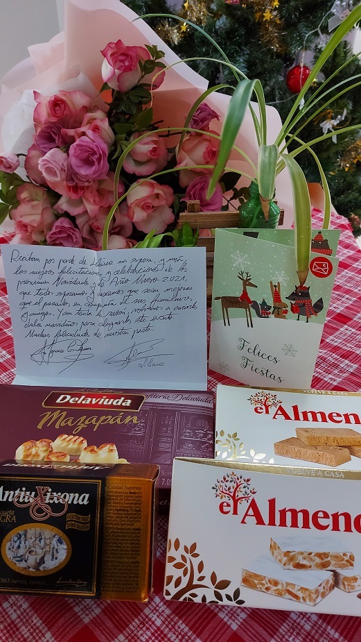 Emilia: Sí, recuerdo que están riquísimos. Este es el tercer año consecutivo que recibimos regalos de este tipo de José y Liliane. En el paquete hay también una hermosa tarjeta que dice: “Reciban por parte de Liliane, mi esposa, y mía las mejores felicitaciones y celebraciones de la próxima Navidad y el Año Nuevo 2021, que todos deseamos que sean mejores que los pasados, en compañía de sus familiares y amigos”.