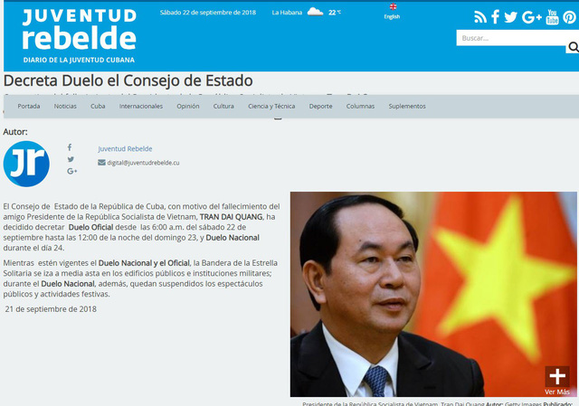 El periódico cubano, Juventud Rebelde anuncia el fallecimiento del presidente vietnamita, Tran Dai Quang |