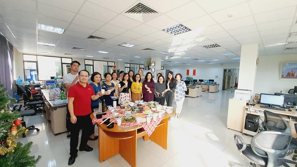 Trabajadores varones de las secciones en español, francés, alemán y ruso celebran una fiesta para honrar a sus colegas femeninas con motivo del Día de la Mujer Vietnamita. |