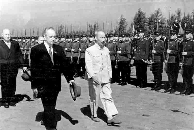 El presidente Ho Chi Minh pasa revista a la guardia de honor del ejército soviético durante la ceremonia de bienvenida a una delegación del gobierno vietnamita de visita oficial a la Unión Soviética el 12 de julio de 1955. (Foto: VNA) |