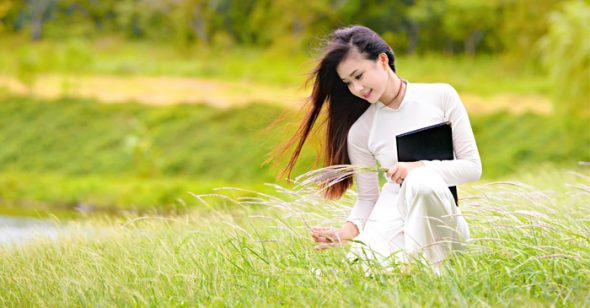 Una chica vietnamita vestida con la túnica tradicional |
