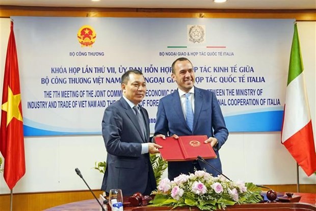 El viceministro de Industria y Comercio Dang Hoang An (i) y el vicetitular de Asuntos Exteriores y Cooperación Internacional de Italia, Manlio Di Stefano, en la reunión del Comité Conjunto de Cooperación Económica entre ambas naciones, el 7 de junio pasado. (Foto: VNA) |