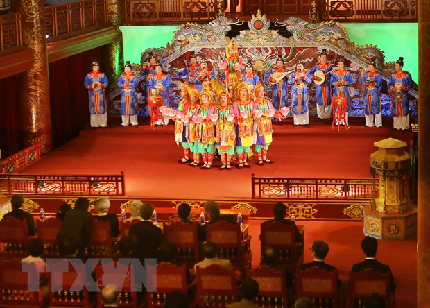 El emperador japonés Akihito y la emperatriz Michiko escuchan música de la corte real de Hue en el Teatro Duyet Thi Duong. (Foto: VNA) |