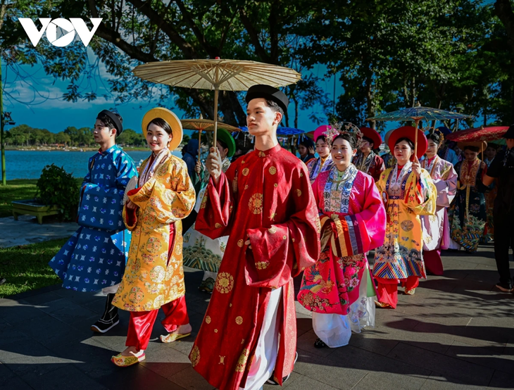 Jóvenes vietnamitas en antiguos trajes tradicionales de su país en un evento organizado en la ciudad de Hue, antigua capital imperial de Vietnam. (Foto: VOV) |