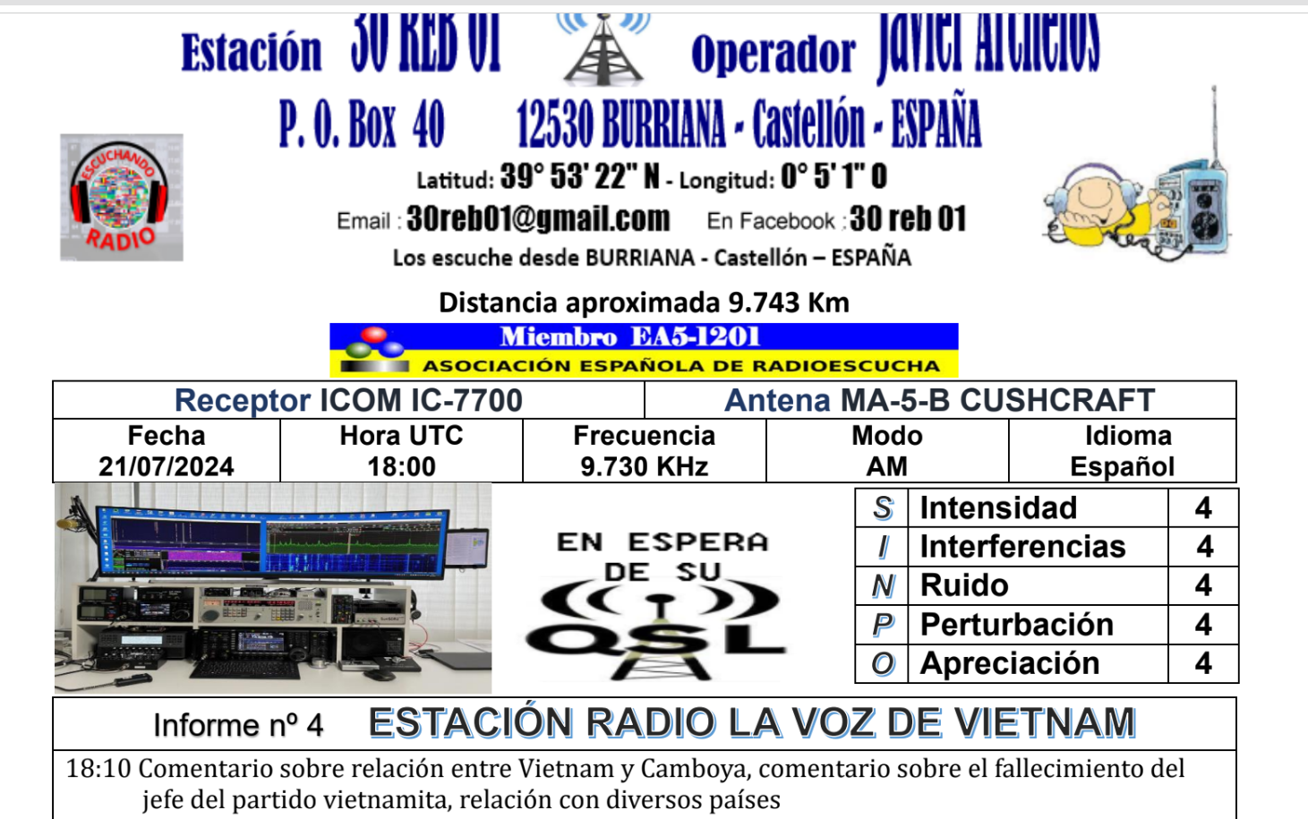 Gracias por darnos a conocer cómo llega la señal de la Voz de Vietnam a sus tierras y esperamos mantenernos en comunicación con todos.