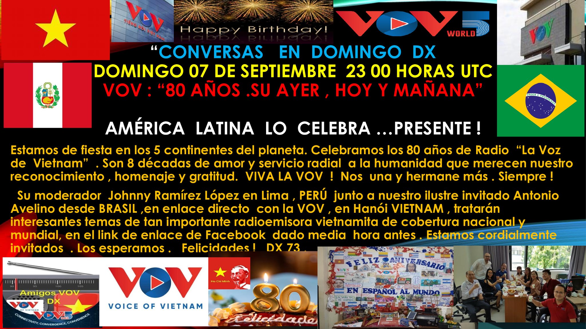 Alfonso: En esta ocasión, Johnny Antonio Ramírez López y Antonio Avelino da Silva, de Brasil, han preparado cuidadosamente la charla en línea “Conversa en Domingo DX”, cuyo tema es “80 años de VOV: Pasado, Presente y Futuro”. El evento tendrá lugar a las 23:00, hora UTC (11:00 hora de Hanói) del 8 de septiembre, a través de la plataforma Facebook. En nombre del host, o conductor de esta charla, Johnny, extiendo la invitación a los miembros de nuestra familia VOV a participar y contribuir al éxito de este evento en honor a VOV.
