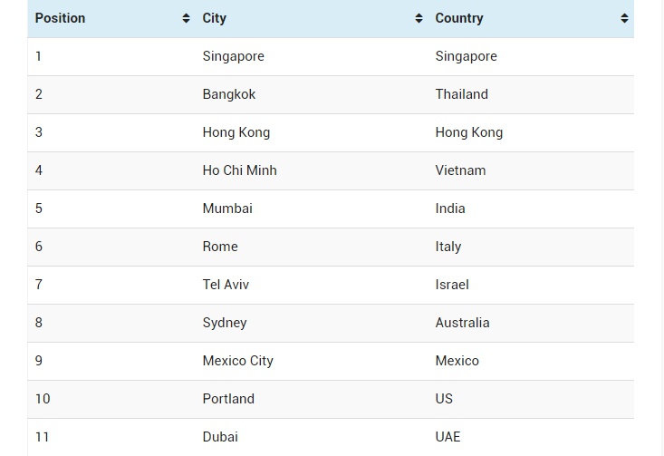 Singapur lidera la lista, mientras Bangkok (Tailandia), Hong Kong (China) y Mumbai (India) se sitúan en los siguientes puestos, en ese orden.