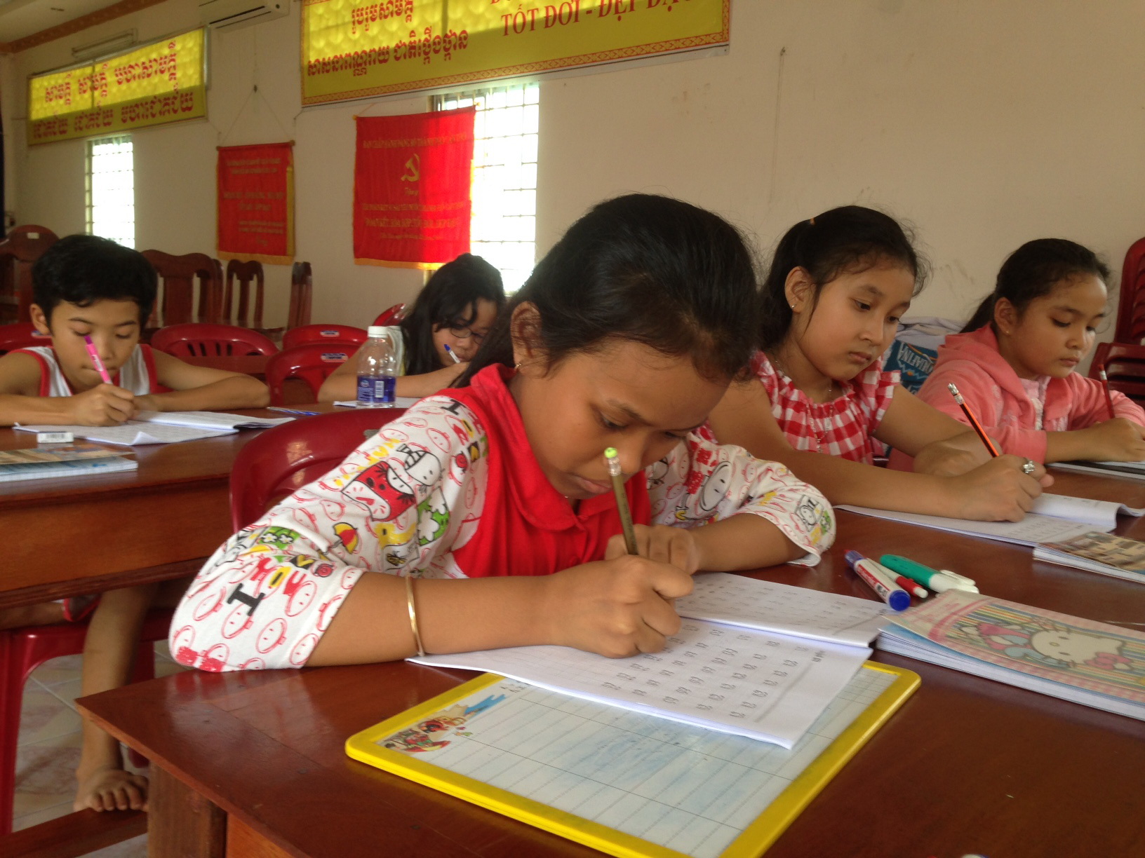 Los menores aprenden cómo escribir las letras jemeres (Foto: VOV) |