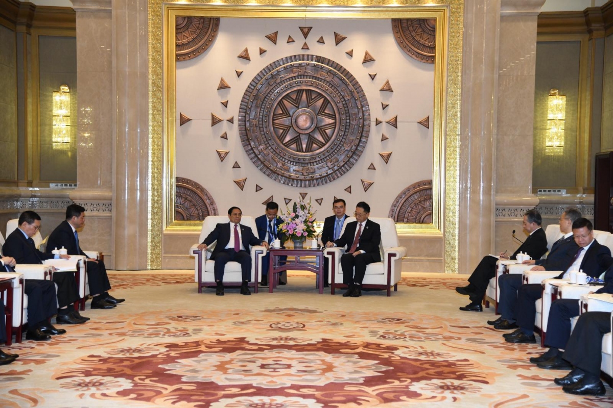 El primer ministro Pham Minh Chinh (i) en la reunión con el secretario del Comité del Partido Comunista de China en la Región Autónoma Zhuang de Guangxi, Liu Ning. |