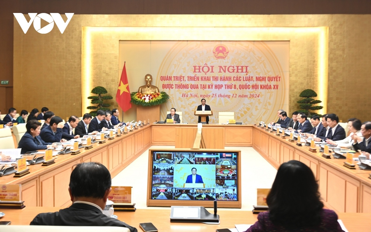 (VOVWORLD) - Una conferencia para comprender e implementar a fondo las leyes y resoluciones aprobadas en el octavo período de sesiones de la Asamblea Nacional, XV Legislatura, se celebró hoy en Hanói bajo la presidencia del primer ministro vietnamita, Pham Minh Chinh, y el presidente del Parlamento, Tran Thanh Man.