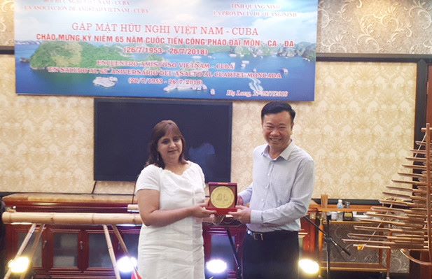 Nguyen Van Huong, presidente del Frente de la Patria en la provincia de Quang Ninh, entregó reconocimiento a la diplomática cubana, Nancy Coro Aguiar. |