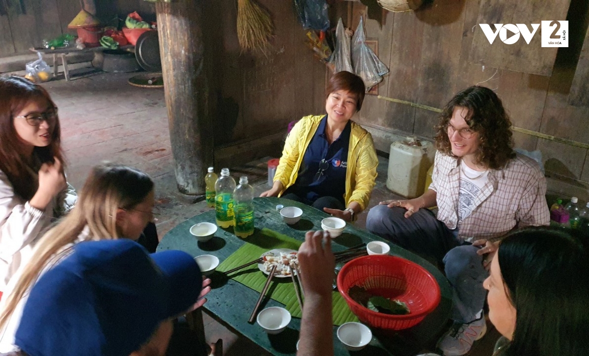 Dinh Thi Hao (chaqueta amarilla) intercambia con turistas extranjeros que visitan Da Bac. (Foto: VOV) |