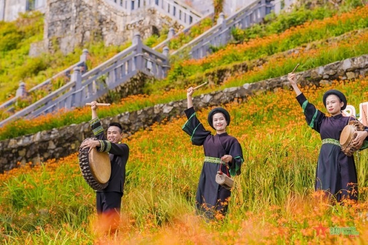 Los campos de crocosmia naranja forman un escenario ideal para danzas tradicionales al son de Mong khèn o los alegres tambores de los Dao Rojo. Foto: qdnd.vn |