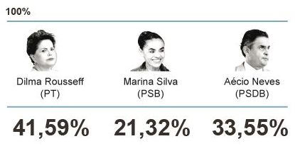 Dilma Rousseff se llevó la mayoría de los votos en la primera ronda de las elecciones de este domingo, con un porcentaje del 41,08%, frente al 34,20% obtenido por Aécio Neves, que selló el segundo lugar. Una candidata potencial a la Presidencia de Brasil, Marina Silva, se hizo con un solo 21% de los votos. Con estos resultados, esta representante del Partido Socialista quedó fuera de la contienda final.