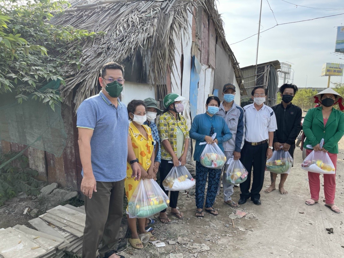 El señor Hiep (primero a la izquierda) entrega apoyo material a los necesitados debido a la pandemia. (Foto: Hoang Hiep) |
