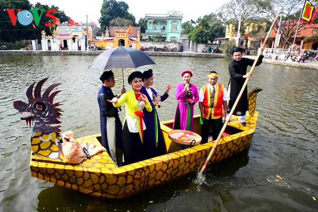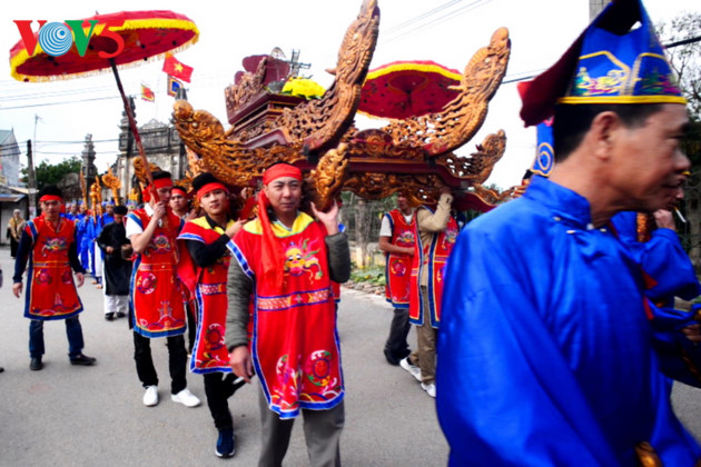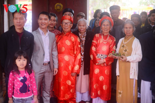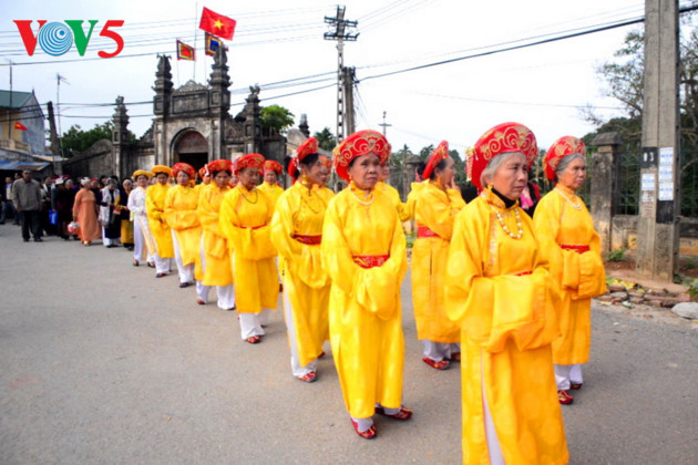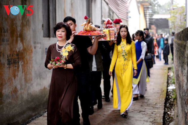 | El festival reproduce el momento en que el genio tutelar de Tam Giang iba a la pagoda en busca de su madre y su esposa, a quienes luego traería de vuelta a la casa comunal para compartir las ofrendas. |