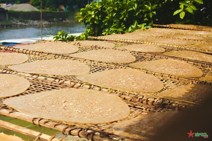 En las pequeñas callejuelas, los aldeanos secan sus crepes en estantes oblicuos o verticales, creando una decoración cautivadora. Foto: Hồng Phúc/qdnd.vn |