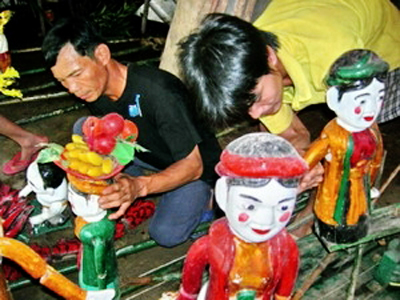 Los espectáculos de guiñol acuático se ofrecen en las fiestas aldeanas, efemérides o festivales populares. Los títeres son tallados en madera de higuera, lo que les hace resistentes al agua. Estas figuras sonrientes y encantadoras se mueven sobre el agua gracias al mecanismo habitual de hilos y palos. En especial, detacan las manos hábiles de los artistas que se quedan en el agua durante gran parte de la función, tras la cortina. Nguyen Van Khoe, del gremio de marionetas acuáticas de Nam Dinh, nos dijo que en los funciones, los titiriteros deben concentrarse al máximo y nos explicó lo siguiente: “En el agua turbia resulta difícil diferenciar el sistema de palos e hilos. Los artesanos deben aprender de memoria cada una de sus herramientas para manejar los títeres. Además, el tiempo es también un factor importante, hay que evitar que los titiriteros no tengan frío. Por otra parte, si el agua está muy alta o muy baja es imposible llevar a cabo la función.”