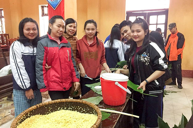 Estudiantes laosianos y camboyanos aprenden a elaborar el banh chung de Vietnam para el Tet |