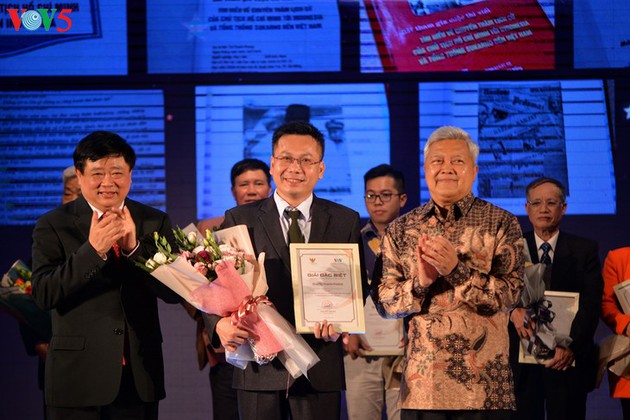 El director general de la VOV y el embajador indonesio en Hanói entregan el Gran Premio a Tu Thanh Phong de la ciudad central de Da Nang. |