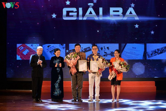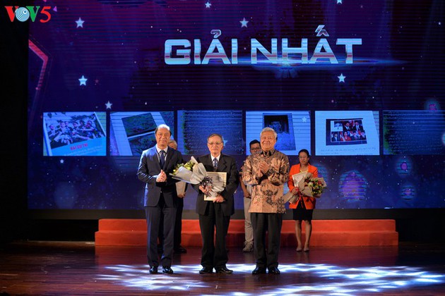 El viceministro de Cultura, Deporte y Turismo de Vietnam Ta Quang Dong y el vice director general de la VOV Tran Minh Hung otorgan el segundo galardón a Dinh Dang Minh de la provincia norteña de Phu Tho. |