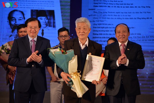 El viceministro de Asuntos Exteriores vietnamita Nguyen Quoc Dung y el embajador de Indonesia Ibnu Hadi, entregan el primer premio a Phi Ba Khoat de Hanói. |