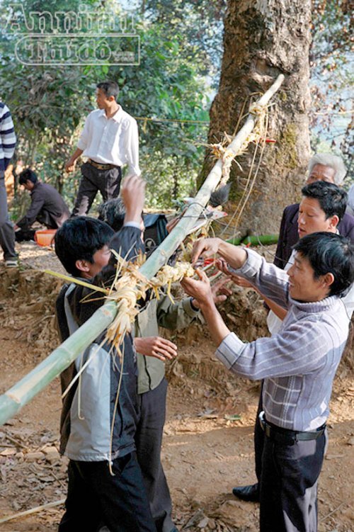 En vísperas del rito ancestral, las mujeres recogen un tipo de hojas típicas destinadas a teñir el arroz glutinoso, mientras los hombres levantan una larga vara de bambú en cuyo extremo se coloca un pollo y se tiende una cuerda hacia el otro lado del camino, colgando en ella figuras semejantes a armas como cuchillos y cimitarras, para repeler a los demonios.