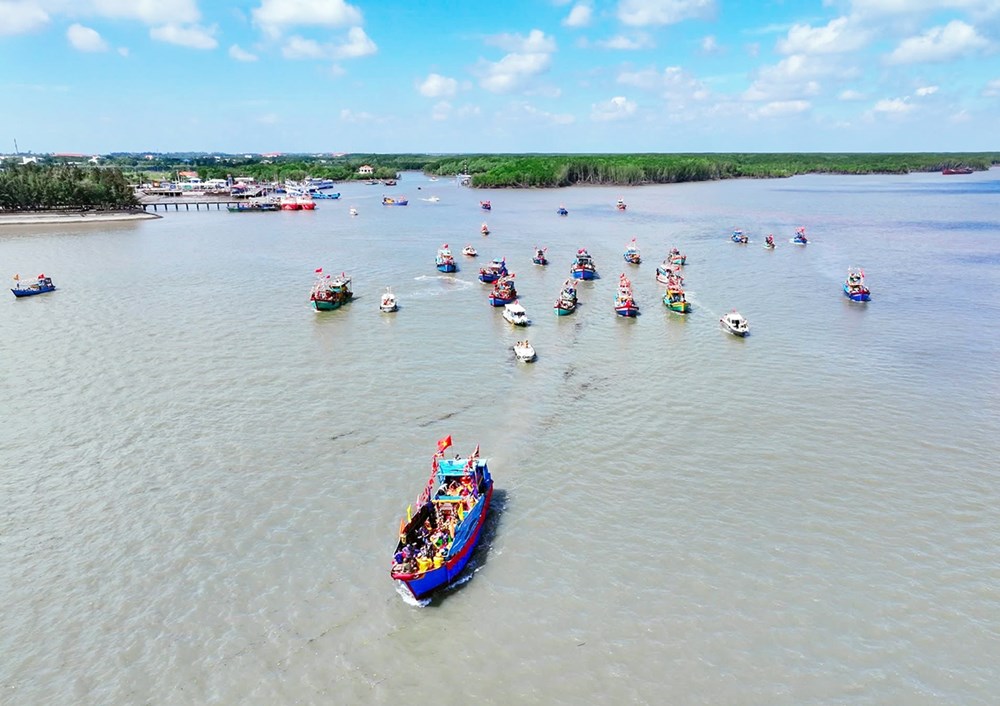 Cientos de embarcaciones pesqueras se unen a la procesión del Señor Ballena, una belleza cultural indispensable en la vida de los habitantes locales, para orar por el buen tiempo climático, por redes llenas de peces y por vigorosa salud para todos. (Foto: baovanhoa.vn) |