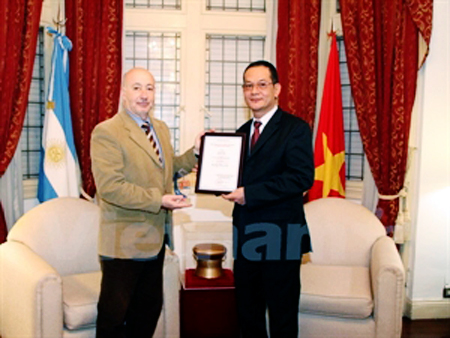 ![]() El embajador de Vietnam en Argentina, Nguyen Dinh Thao entrega el premio al periodista argentino, Horacio Raña