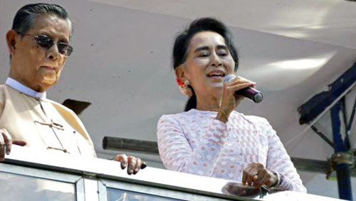 ![]() El comandante en jefe de Servicios de Defensa de Myanmar, general Min Aung Hlaing (d) y la líder opositora birmana Aung San Suu Kyi