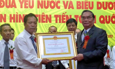 El miembro permanente del Secretariado del Comité Central del Partido Comunista de Vietnam, Le Hong Anh, entrega la Orden del Trabajo, segunda categoría al agricultor Ha Tan Tam (i)