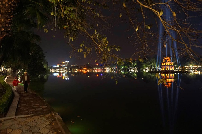 La torre de la Tortuga en la noche, parece una lámpara que refleja luces a la superficie del lago Hoan Kiem
