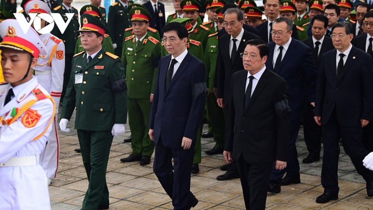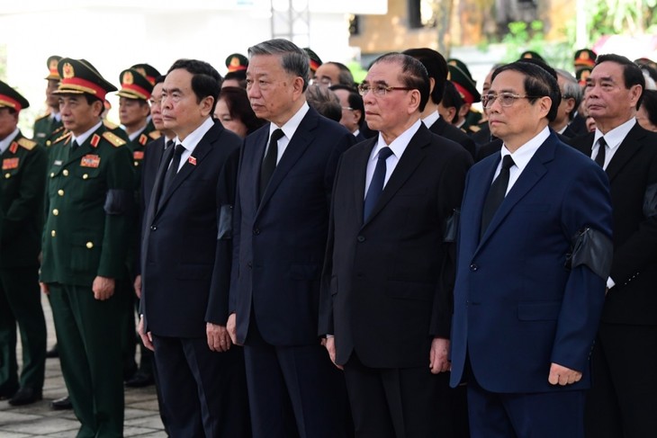El miembro del Buró Político y primer ministro Pham Minh Chinh, al frente de la delegación del Gobierno, el miembro del Buró Político y presidente To Lam, al frente la delegación del Estado, el miembro del Buró Político y titular de la Asamblea Nacional Tran Thanh Man, al frente de la delegación del Parlamento y el miembro del Buró Político y presidente del Comité Central del Frente de la Patria de Vietnam, Do Van Chien, al frente de una delegación de esta organización de masas, rindieron homenaje al difunto líder.