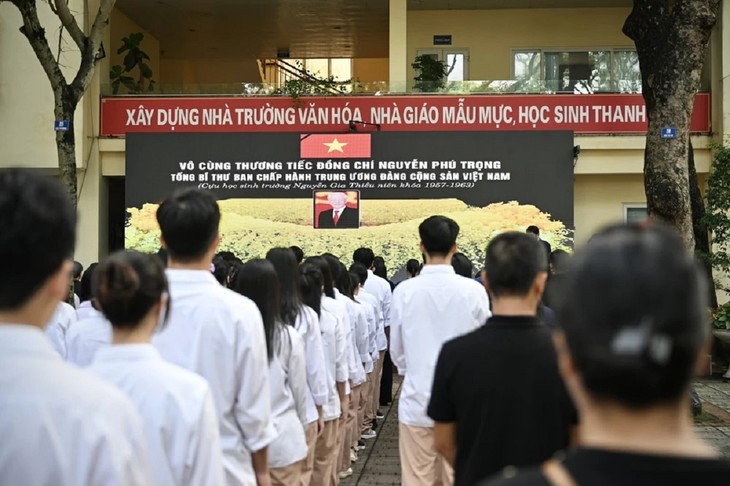 Funcionarios, profesores y estudiantes de la escuela secundaria Nguyen Gia Thieu, donde estudiaba Nguyen Phu Trong, guardan un minuto de silencio para rendir homenaje al líder. (Foto: Vietnam+) |