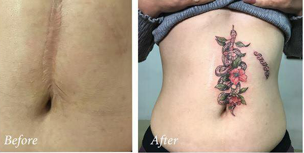 Cada línea de la rama de flor aparecía cada vez más claramente y después de 10 horas de arduo trabajo, la tatuadora creó una bella obra de arte a partir de una cicatriz. Esta nueva imagen dejó a la clienta extremadamente satisfecha.