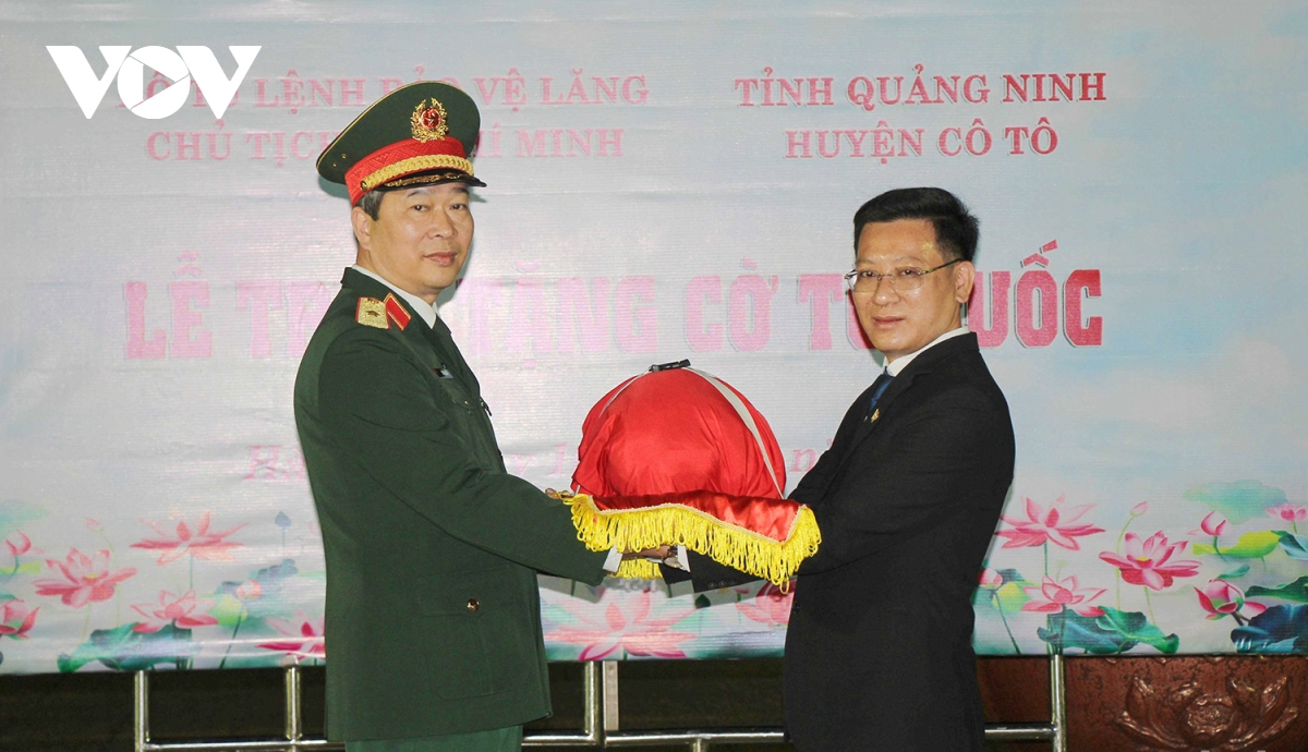El jefe del Alto Mando de Protección del Mausoleo de Ho Chi Minh, Bui Hai Son, entrega la bandera al Presidente del Comité Popular del Distrito de Co To, Nguyen Viet Dung. (Foto: VOV) |