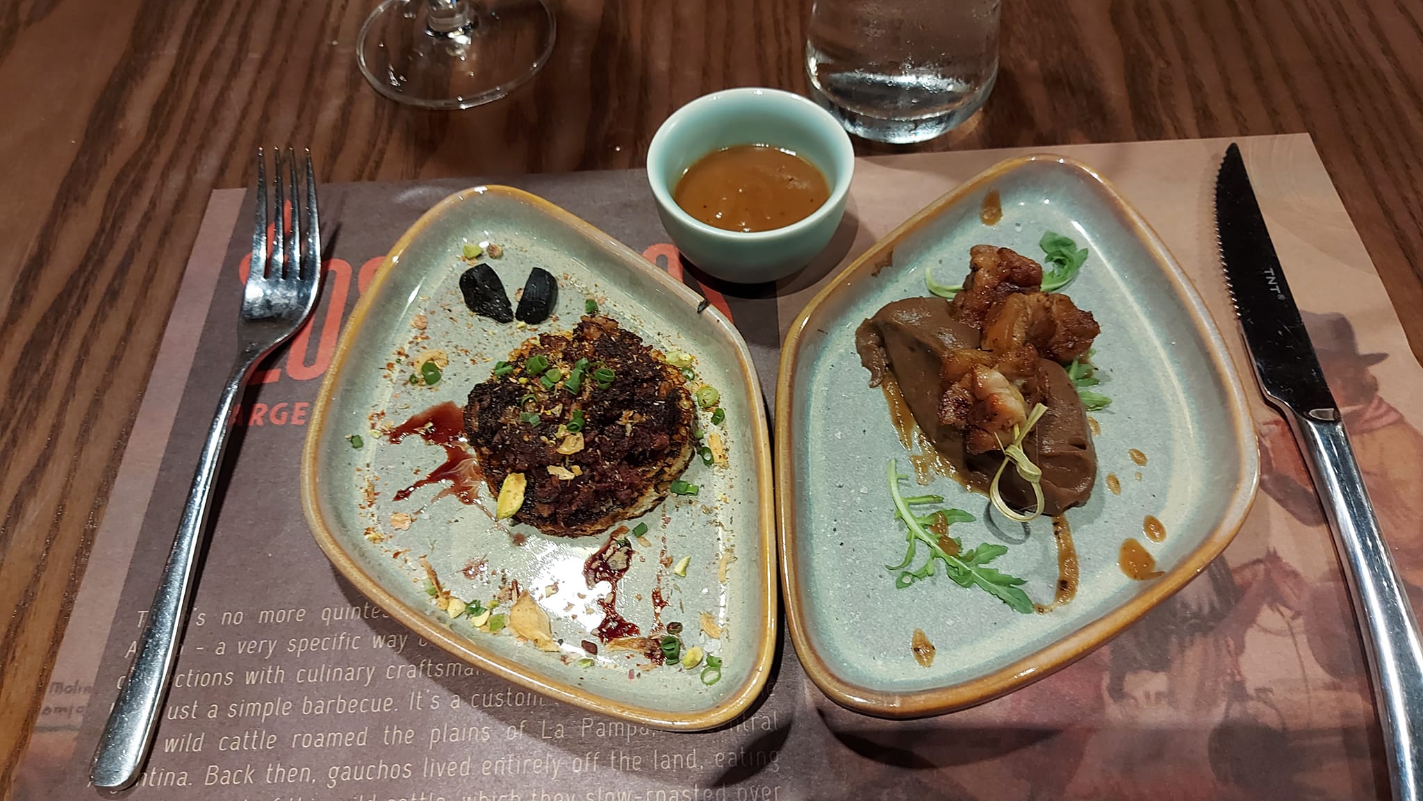 Bruschetta de Morcilla casera y Mollejas de Ternera con pure de Ajo negro y reducción de Manzana y Sidra, manjares del restaurante Los Fuegos. (Foto: Tuan Anh/VOV5) |