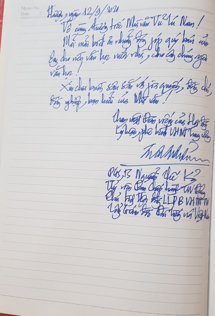 Mensaje escrito por el director general de la Voz de Vietnam, Nguyen The Ky, en el libro de condolencias a la familia de Vu Tu Nam (Foto: VOV) |
