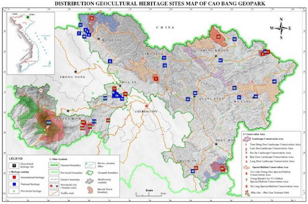 Este parque tiene una extensión de cerca de 3.300 kilómetros cuadrados y abarca 9 distritos de la provincia septentrional de Cao Bang. Los científicos han descubierto más de 130 sitios de patrimonio geológico único, con formas topográficas y paisajes espectaculares como el lago de Thang Hen, el Parque Nacional de Phia Uoc-Phia Den, la cascada de Ban Gioc (una de las cuatro cascadas fronterizas más grandes y hermosas del mundo), la cueva de Pac Bo y el arroyo de Lenin. |