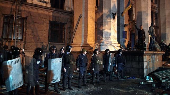La Policía, apostada delante del edificio encendiado en Odessa