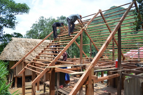 ![]() Pobladores de la aldea Kalu participan en el programa de restauración de las viviendas tradicionales de su etnia