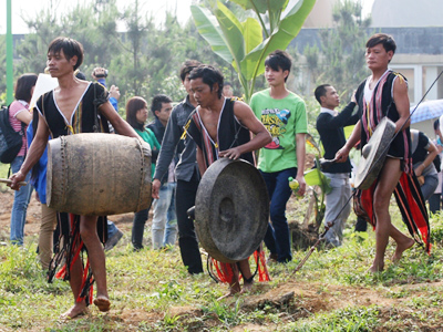 Cuando resuenan los gongs y batintines, el patriarca reza las oraciones rituales para invitar a los genios a participar de la ceremonia y bendecir a los aldeanos. En la resonancia de los instrumentos y la trituración de arroz, el anciano embadurna con la sangre del animal sacrificado las nuevas viviendas, la casa comunal (nha Rong), los batintines o Chieng Tha, las tinajas de alcohol y las cestas de semillas, considerado como una manera de contacto con las deidades. A finales de marzo y principios de abril todos los años, cuando comienzan las lluvias veraniegas, los pobladores inician sus preparativos para la ceremonia de esparcimiento de semillas con el fin de pedir por una cosecha abundante de arroz. Thao, la, patriarca de la aldea Dak Me, comuna de Bo Y, distrito de Ngoc Hoi, provincia de Kon Tum, compartió: “Cada vez que los Brau entran en sus nuevas viviendas y casas comunales, realizan una ceremonia de sacrificio del búfalo para rezar por los terrenos, las tierras cultivables y el agua potable para la prosperidad aldeana”.