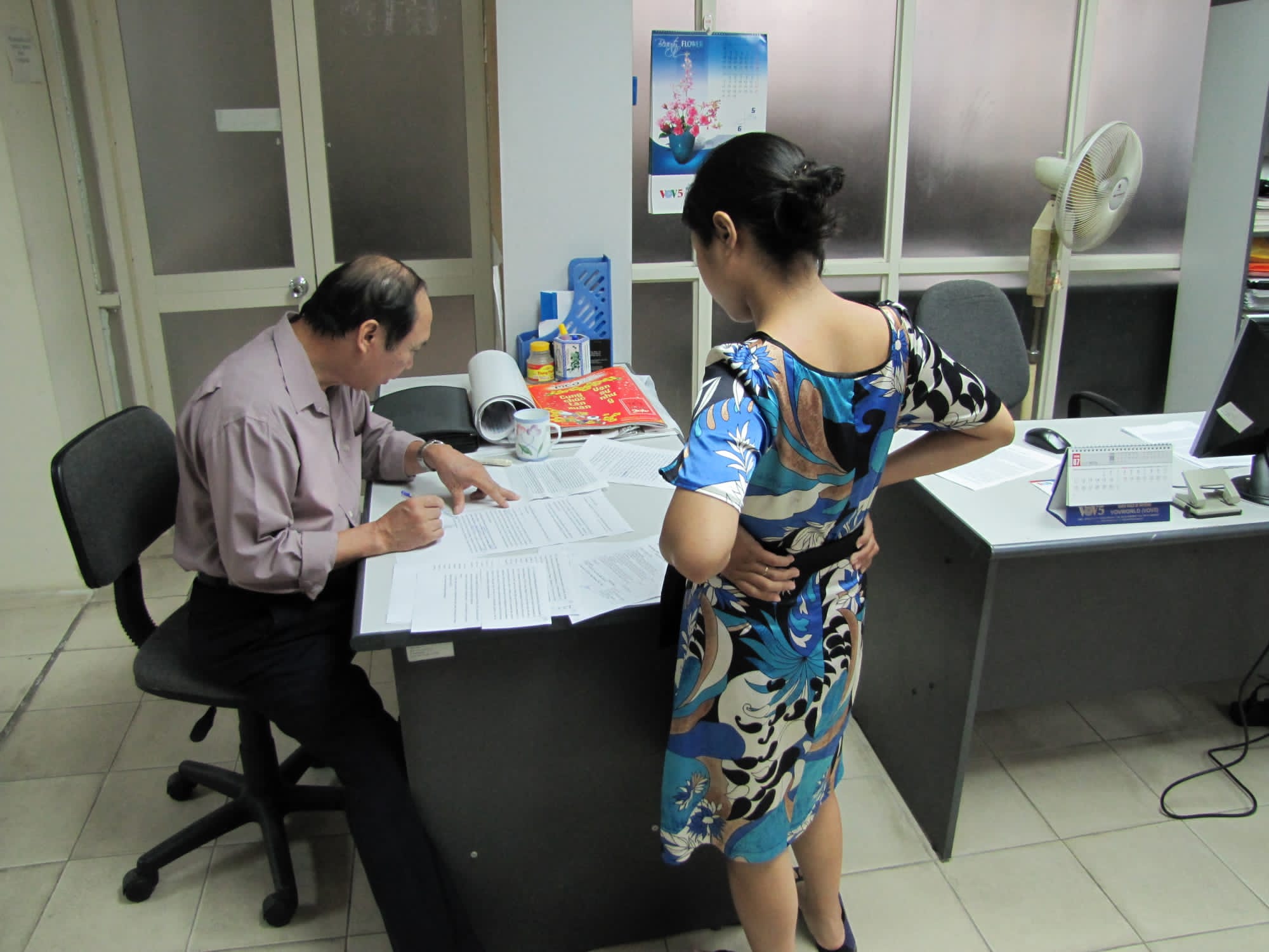 Una imagen familiar del editor Nguyen Van Bac en su mesa de trabajo en la antigua sede de la Sección en español de VOV5. (Foto: Cortesía de Carlos Morales) |