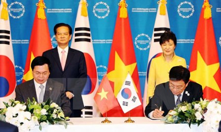 ![]() El primer ministro de Vietnam, Nguyen Tan Dung y la presidenta de Corea del Sur, Park Geun-hye testimonian la firma del Tratado de Libre Comercio entre ambas naciones (Foto:VNA)