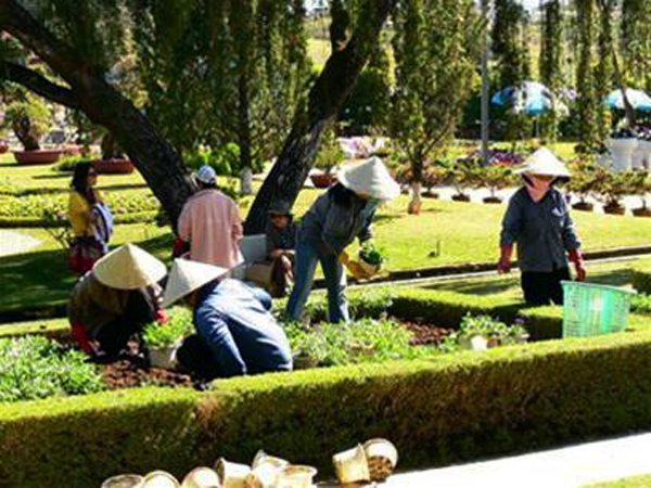 ![]() Horticultoras cuidan flores en el parque central de la ciudad de Da Lat