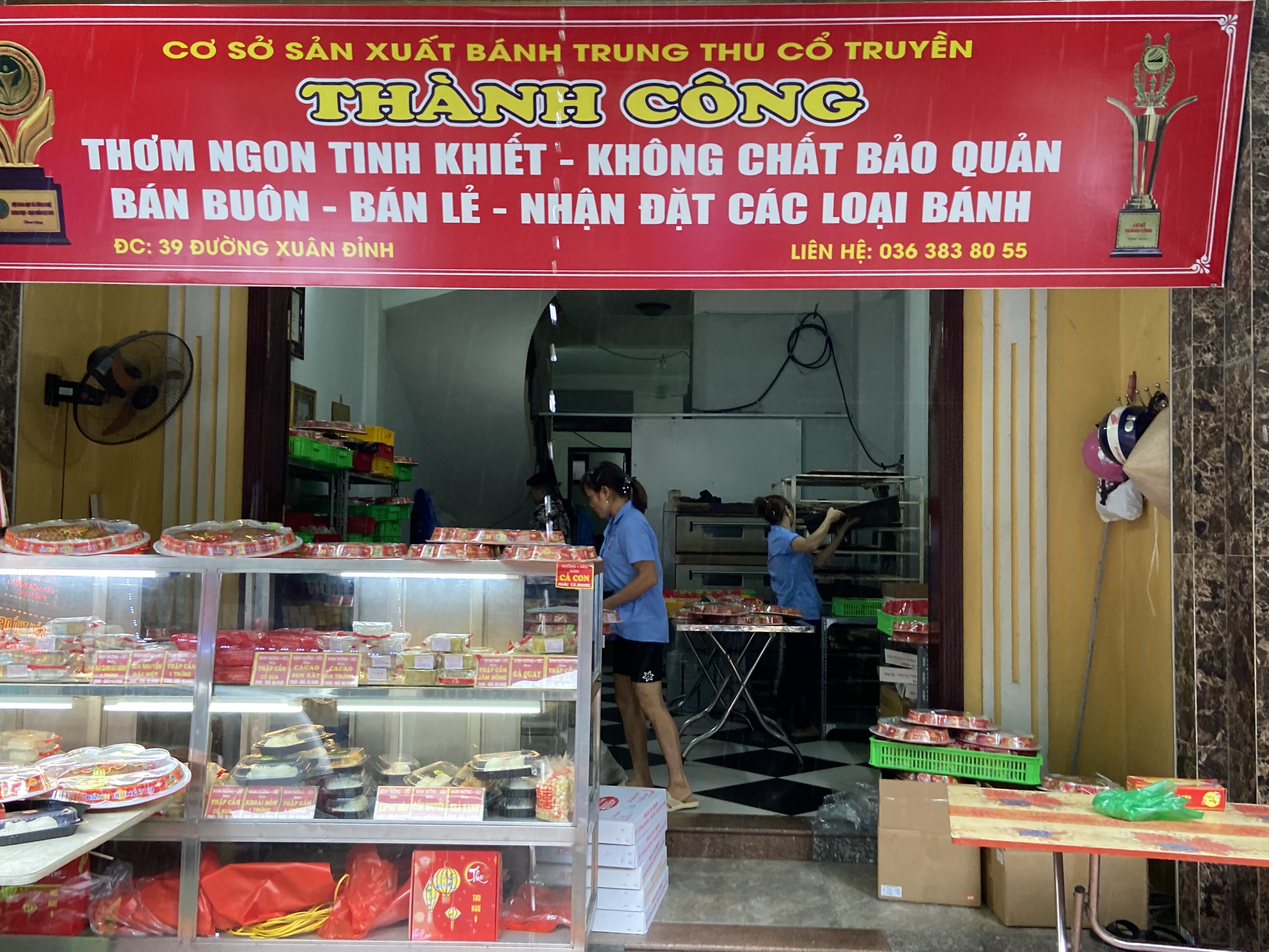 Cuanto más se acerca el Festival del Medio Otoño, más gente viene a Binh Trung y otras pastelerías similares de Xuan Dinh para comprar pasteles de luna. Lo especial de estas tiendas de repostería es que también poseen las instalaciones de producción. Tienen los puestos de venta en el exterior y el horno en el interior, al cual los clientes pueden acceder y contemplar todos los pasos de la elaboración de este postre tradicional. Allí trabajan decenas de empleados y cada uno se encarga de una tarea, como amasar la harina, dar forma a la masa y hornear.